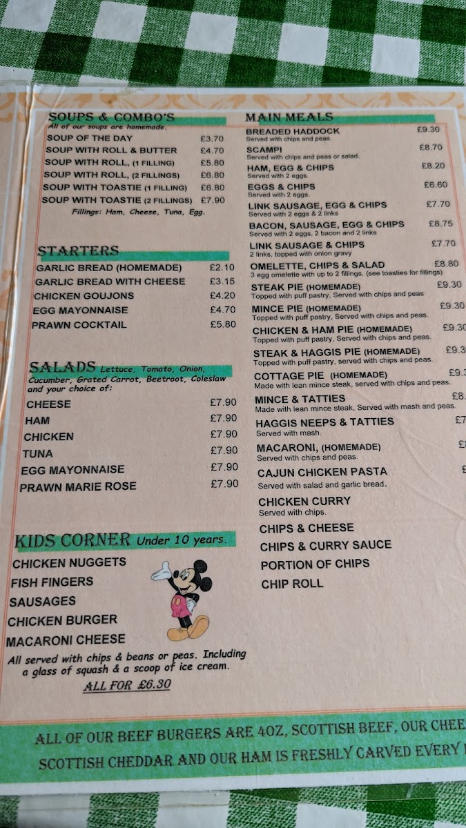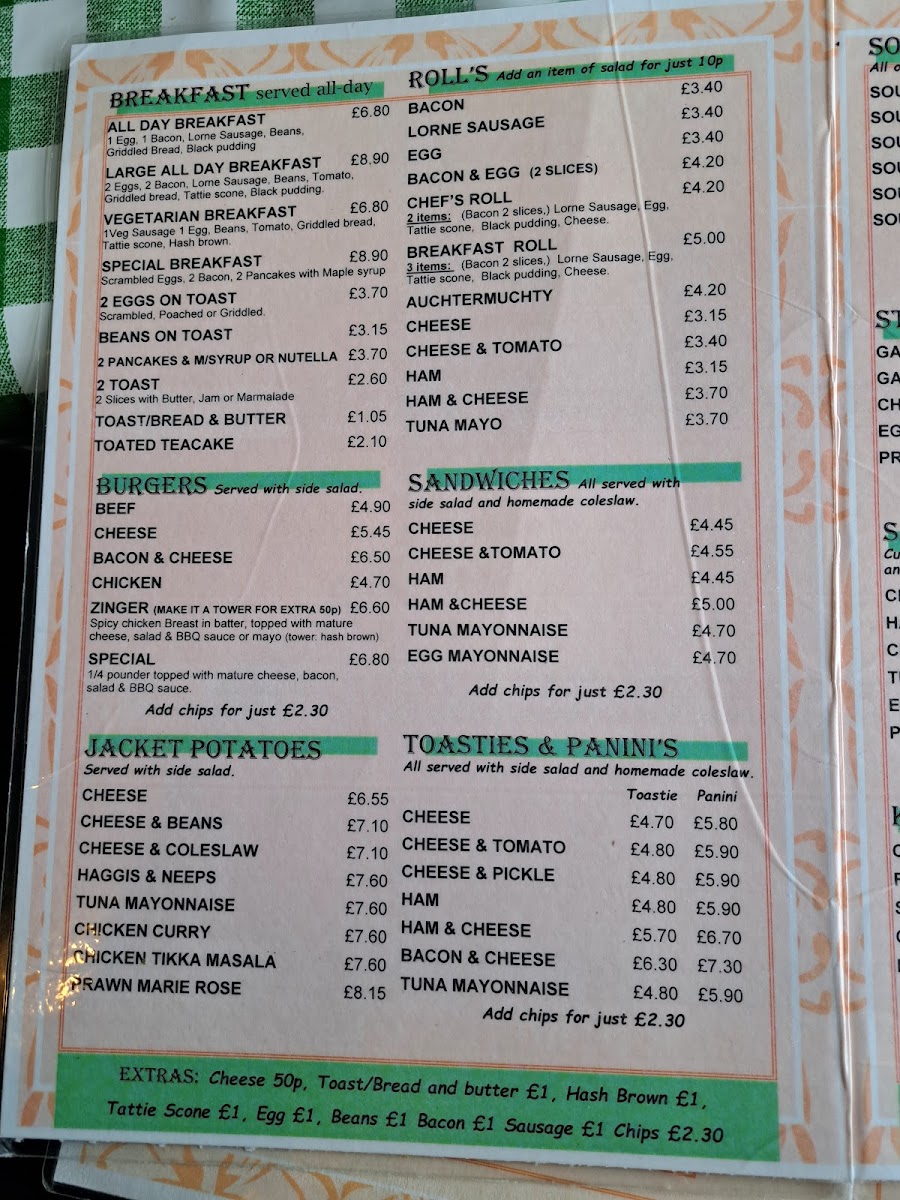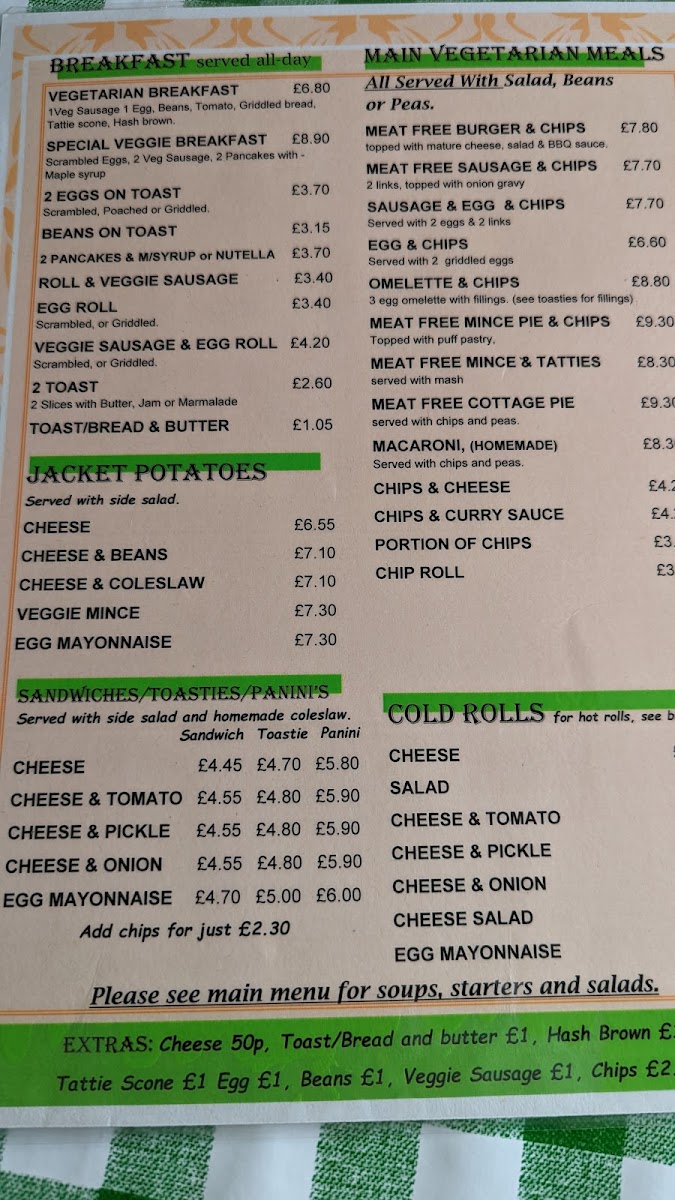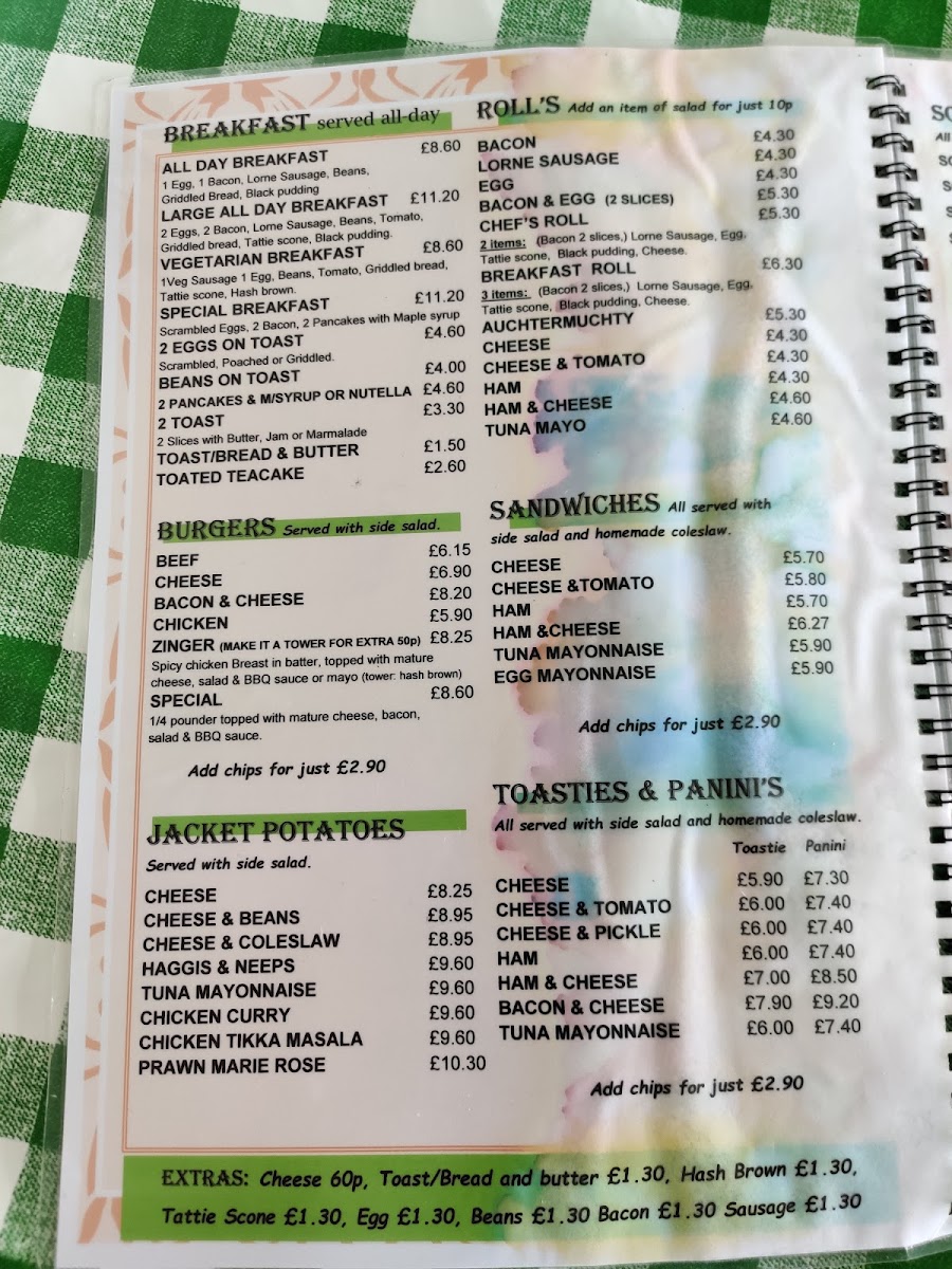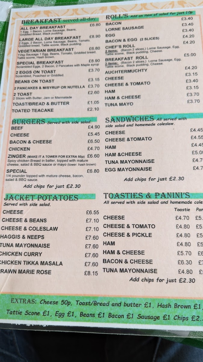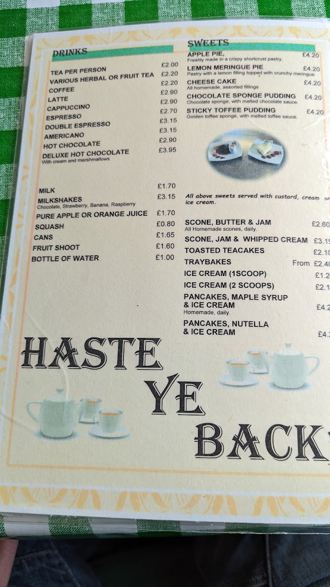 Guests can enjoy a variety of satisfying options throughout the day—from a traditional all day breakfast featuring bacon, sausage, eggs, and chips to lighter bites like cheese and ham toast or a cheese and bacon panini. The menu also includes warm, homely treats such as toasted teacakes, pancakes with syrup, and a selection of freshly made cakes, including raspberry & coconut cream.